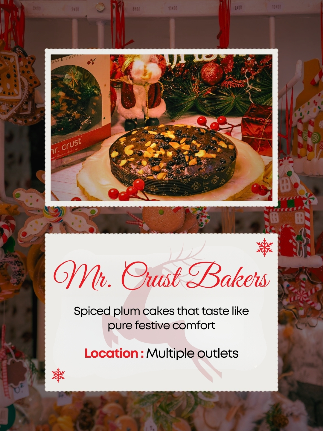 Mr. Crust Bakers is known across the city for its dependable, no-fuss baking. During Christmas, their spiced plum cakes take centre stage, offering familiar festive flavours that work for both gifting and home celebrations. It is a go-to option when you want something comforting and consistent.