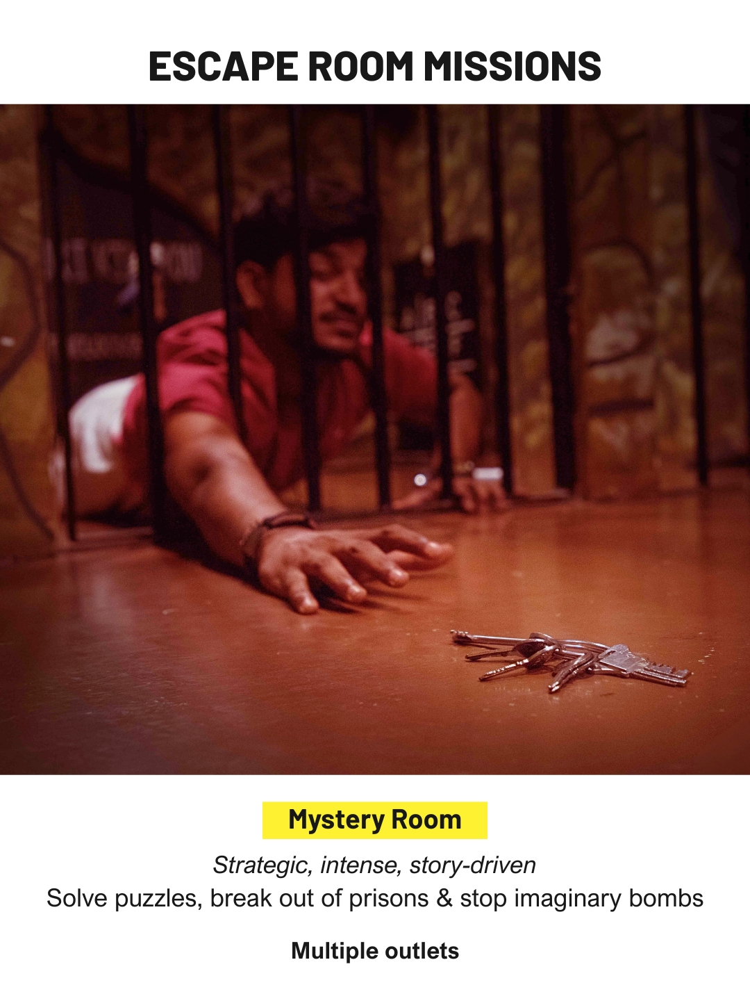 Mystery Rooms offers themed escape missions that involve heists, prison breaks and bomb defusal scenarios. Teams solve puzzles under time pressure, making this an intense mental workout that blends storytelling with strategy.