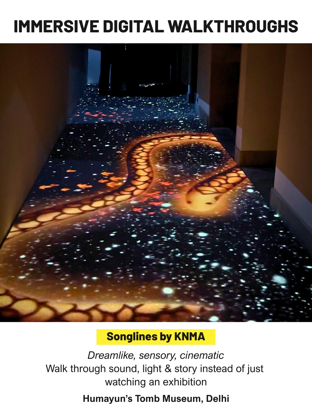 Songlines offers a multi-sensory digital experience where sound, light and storytelling merge into a walk-through installation. Visitors do not simply observe exhibits here. They move through layered narratives and audio-visual environments that feel closer to stepping inside an artwork than viewing it from outside. It is one of Delhi’s most distinctive indoor cultural experiences.