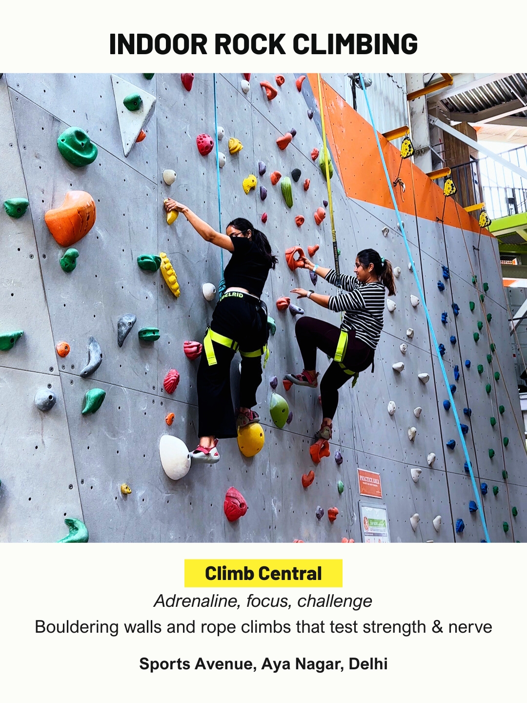 Climb Central brings outdoor climbing intensity indoors with its range of bouldering walls, rope climbs and speed challenges. Designed for beginners as well as experienced climbers, the centre offers a structured environment to test strength, balance and endurance. It is one of Delhi NCR’s most serious indoor fitness and adventure spaces.
