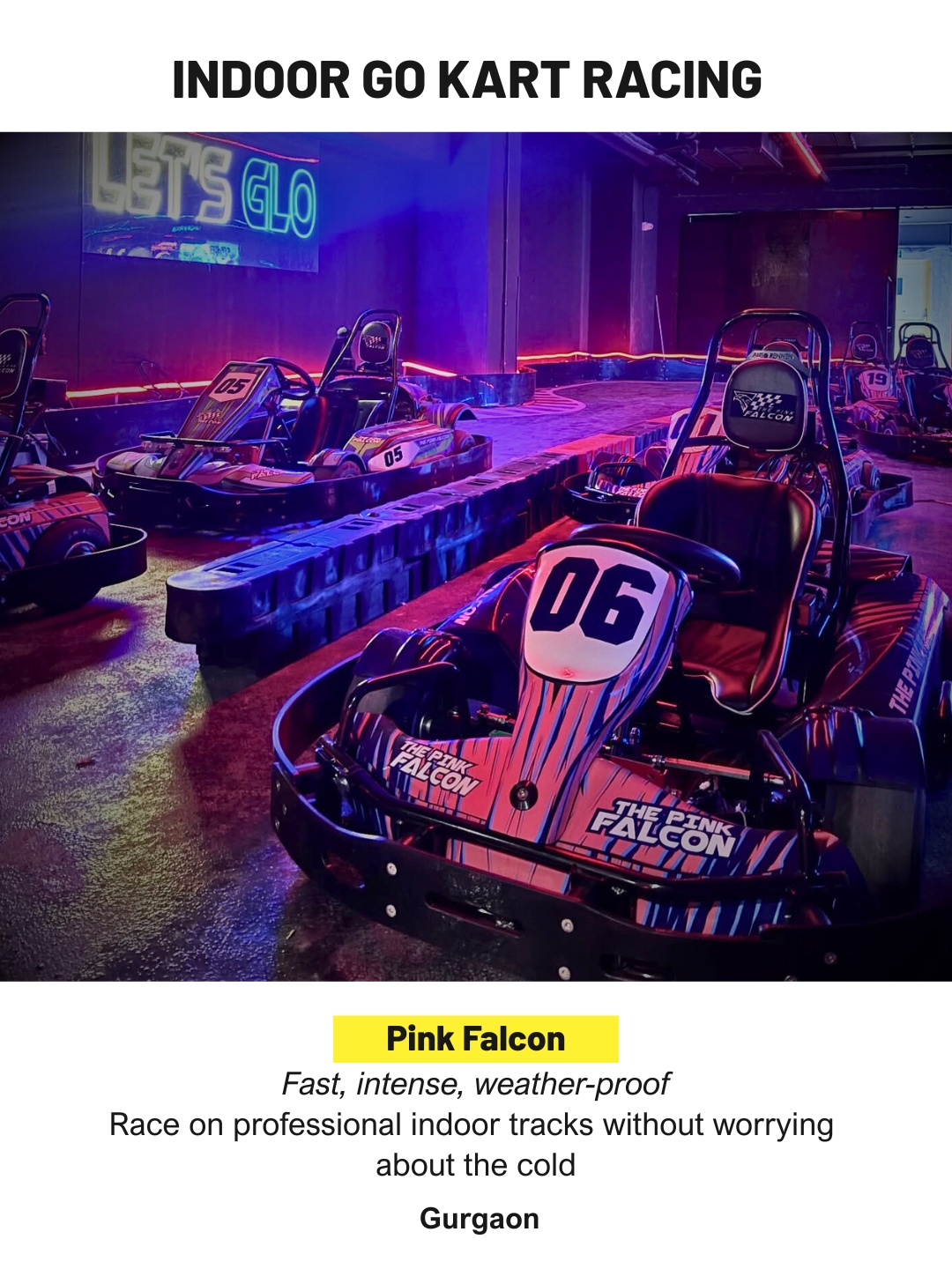 Pink Falcon offers professional-grade indoor go karting tracks that allow racing in all weather conditions. With safety-focused design and fast-paced circuits, it provides a genuine motorsport experience that stays active even when outdoor tracks become uncomfortable in winter.