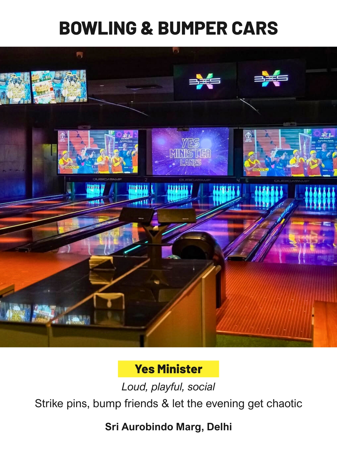 Yes Minister blends bowling alleys with classic bumper car zones to create a lively indoor social space. It is perfect for casual competition, friendly chaos and late evening outings where fun and noise are part of the plan.