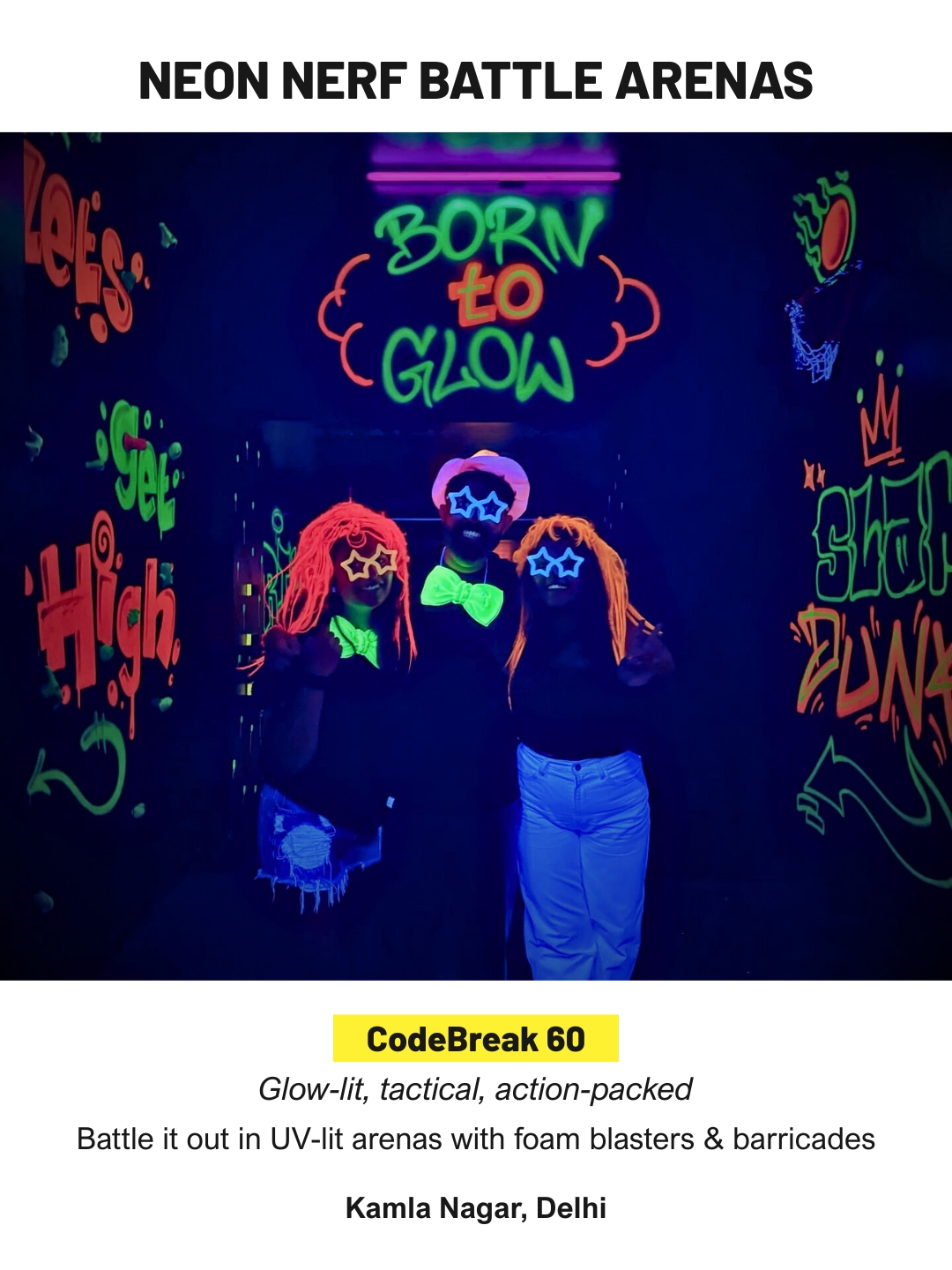 CodeBreak 60 features neon-lit Nerf arenas with UV-reactive walls and glowing barricades. Visitors battle it out with foam blasters in an organised but energetic environment. It is one of the most action-packed indoor experiences in North Delhi.