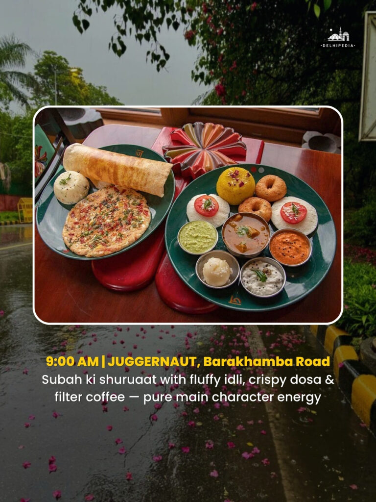 Begin your chhutti with warmth on a plate. Juggernaut is known for its authentic South Indian menu, minimalist interiors, and soul-hugging filter coffee. The fluffy idlis and ghee-laden dosas are perfect to power you through a drizzly morning in Central Delhi.