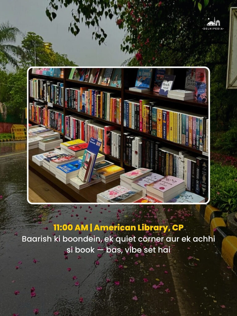After breakfast, take shelter in one of Delhi’s calmest spots — the American Library. Browse through poetry, fiction, or vintage political reads. With rain tapping gently on the windows and the scent of old books around you, it’s the perfect escape from screen time and city noise.
