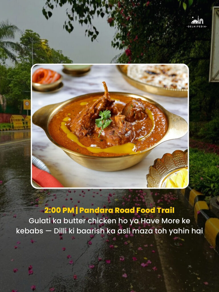 When the rain makes you hungry, Pandara Road delivers. Choose from the creamy butter chicken at Gulati, the flavourful kebabs at HaveMore, or the rich curries at Pindi. This lane is a goldmine of classic Delhi food — and the perfect pit stop before your next adventure.