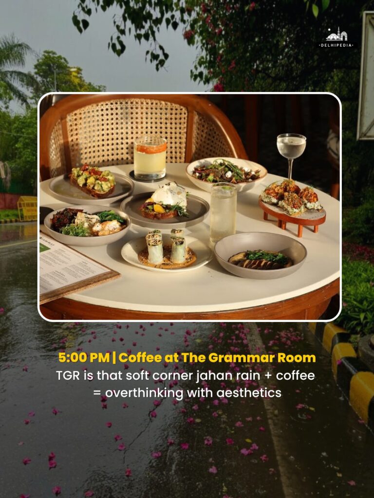 Post-lunch, head to Khan Market for a relaxed stroll. Whether it’s books from Bahrisons, candles from Good Earth, or just some rainy day window shopping, the blend of old-school charm and new-age lifestyle here feels like a cinematic monsoon sequence.