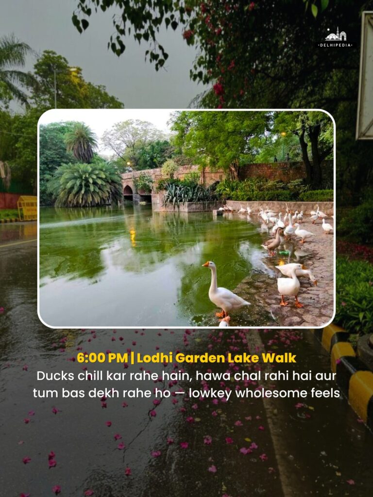 Lodhi Garden becomes a different world during monsoon. Walk around the lake, watch ducks glide over still water, or sit on a quiet bench and take it all in. It’s peaceful, photogenic, and deeply refreshing — like a pause button for the week.
