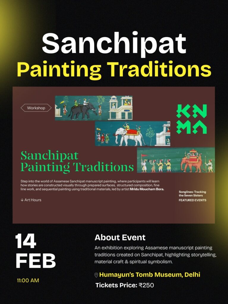 An exhibition exploring Assamese manuscript painting created on Sanchipat, a handmade material derived from treated tree bark. The show highlights storytelling through line, colour, and traditional craftsmanship.