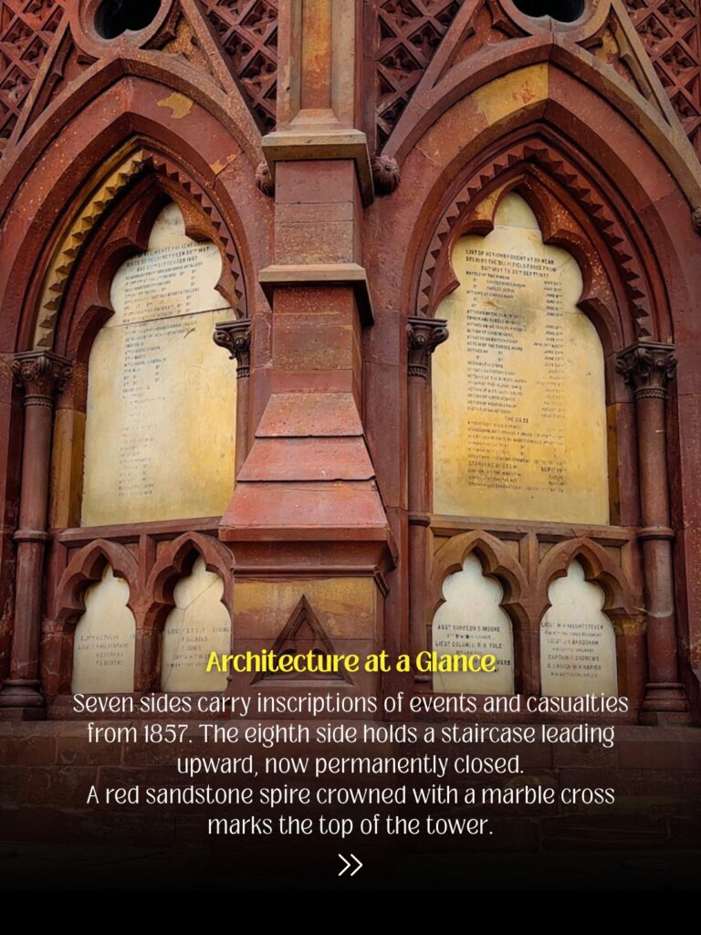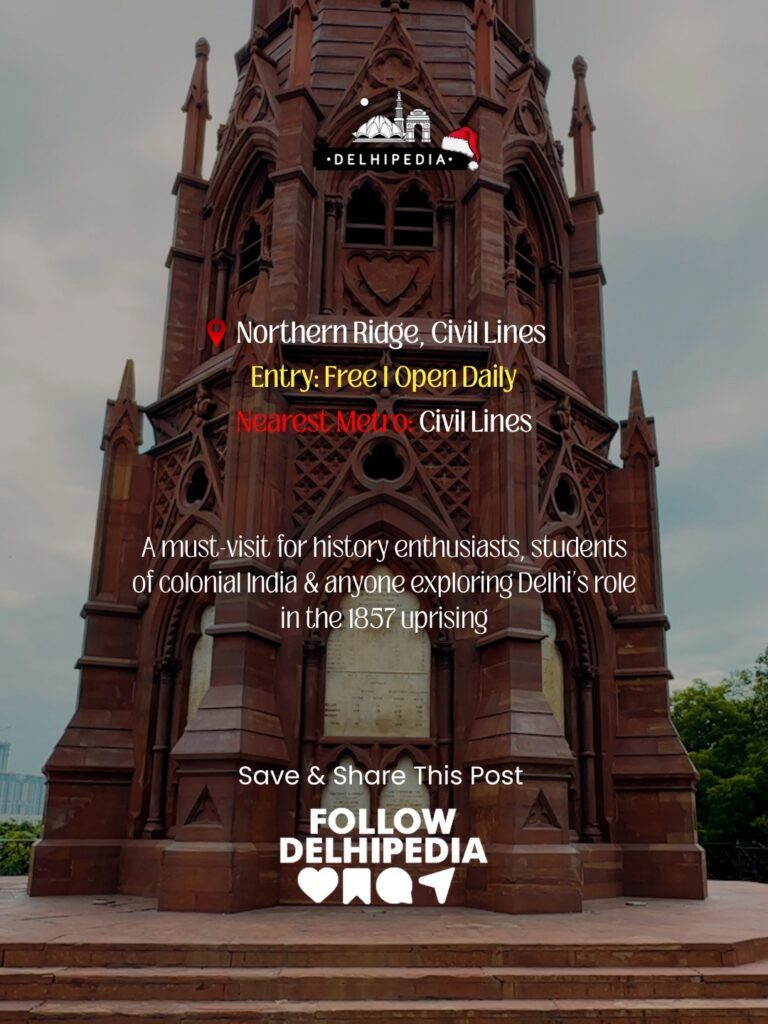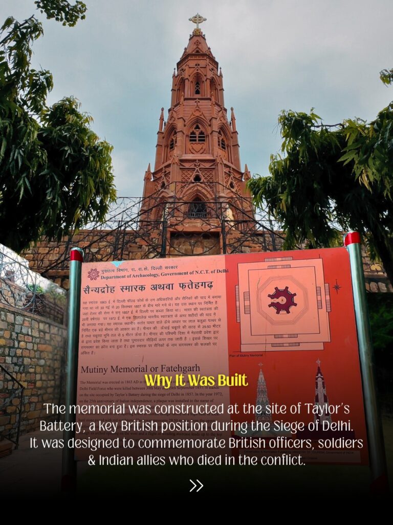 The monument stands on the very site once occupied by Taylor’s Battery during the siege of Delhi in 1857. It was one of the key positions from which the British fired upon the city before retaking it.