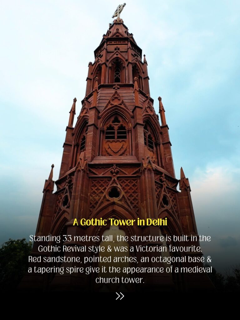 Architecturally, Ajitgarh stands out sharply against Delhi’s predominantly Indo-Islamic landscape. Built in red sandstone, the 33-metre structure rises like a medieval tower or church spire, reflecting the Gothic Revival style popular in Victorian-era Britain.