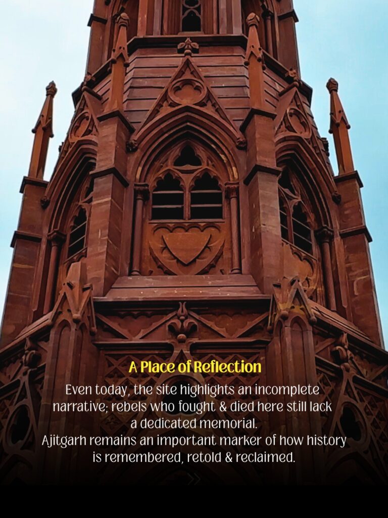 This reinterpretation was meant to reposition the monument within the Indian freedom struggle, but no separate memorial for the rebels was created. Ajitgarh therefore stands today as an unusual space — a British monument carrying Indian counter-memory, two parallel histories inscribed on the same stone.