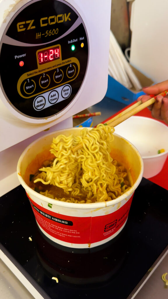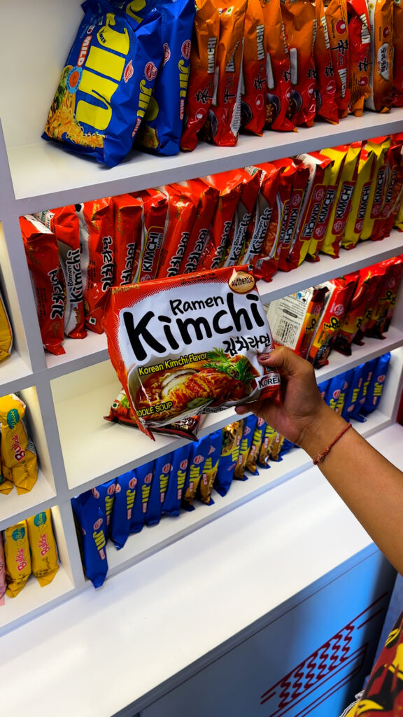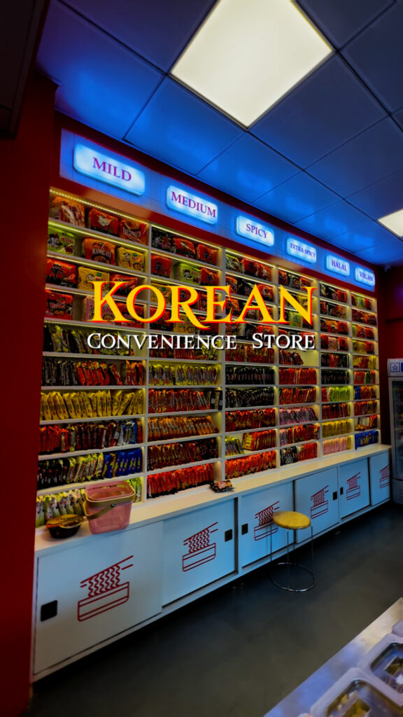The vibe is lowkey but aesthetic — think: cute ramen packets, self-serve stations, K-pop background music, and fridges stocked with unique Korean drinks and ice creams.