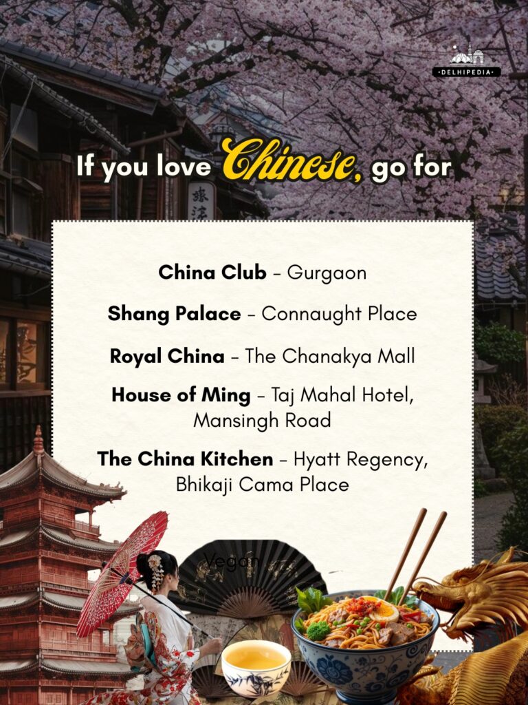 Royal China — Greater Kailash I & Nehru Place: A popular upscale Chinese chain known for dim sum and classic dishes.