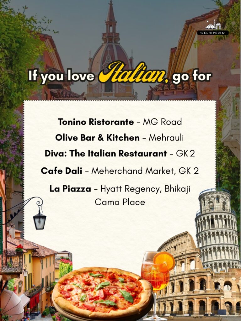 La Piazza — Hyatt Regency, Bhikaji Cama Place: Elegant Italian trattoria known for wood‑fired pizzas and fine pastas.